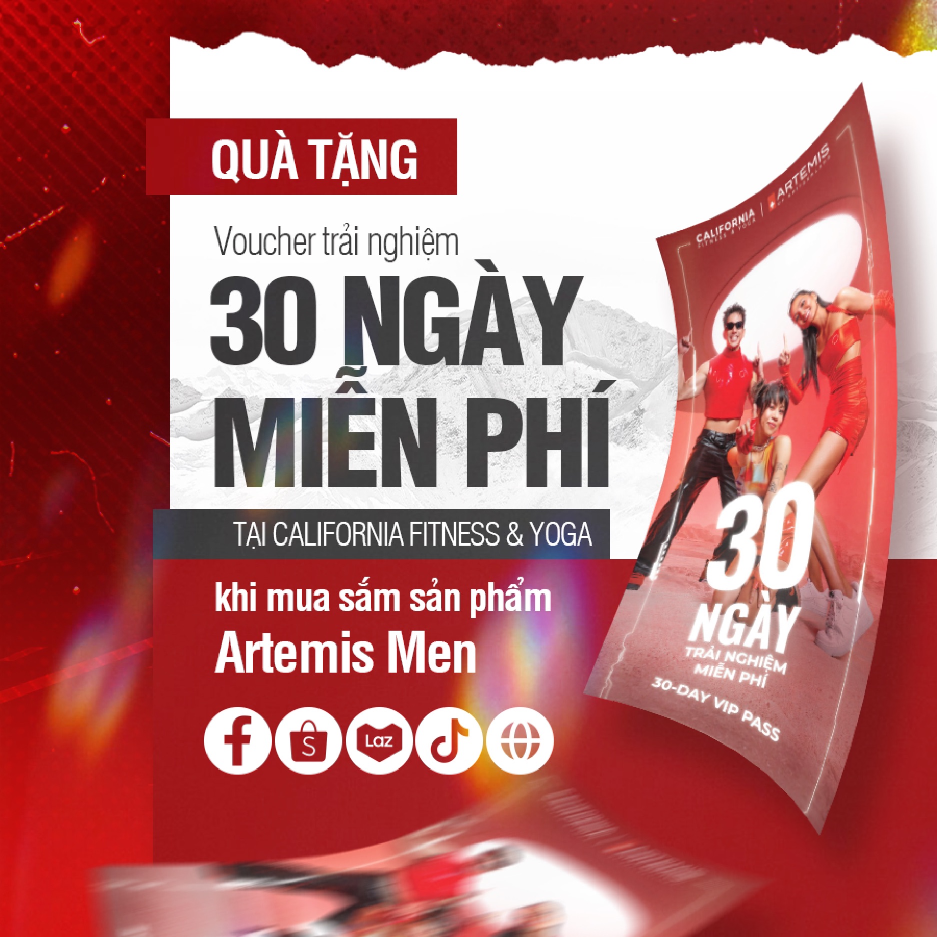 Artemis Men dành tặng cho tất cả đơn hàng Phiếu quà tặng 30 ngày trải nghiệm miễn phí dịch vụ tập luyện tại chuỗi hệ thống California Fitness & Yoga, khi mua sản phẩm Artemis Men tại các gian hàng chính hãng của chúng tôi.