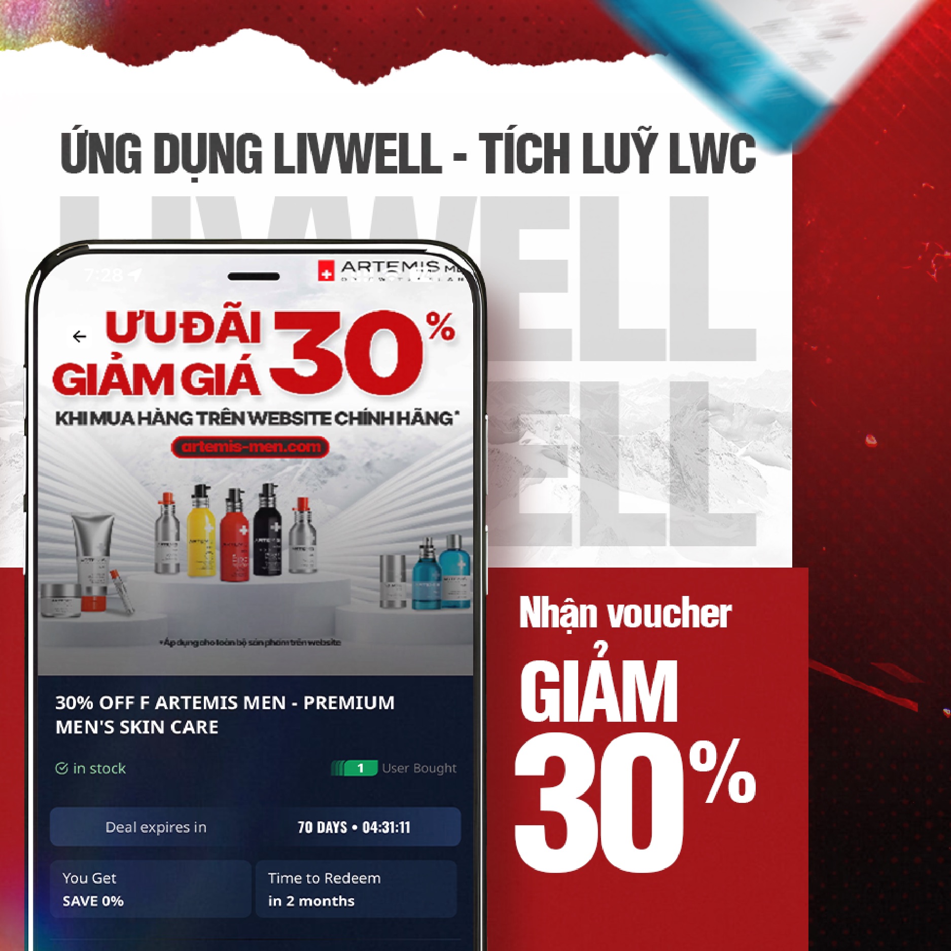 Kết hợp với LivWell Artemis Men dành cho hội viên California và người dùng LivWell ưu đãi giảm 30%. Chỉ với 100 LWC bạn đã có thể sở hữu mã giảm giá đặc biệt, tha hồ mua sắm sản phẩm Artemis Men với giá siêu hời.