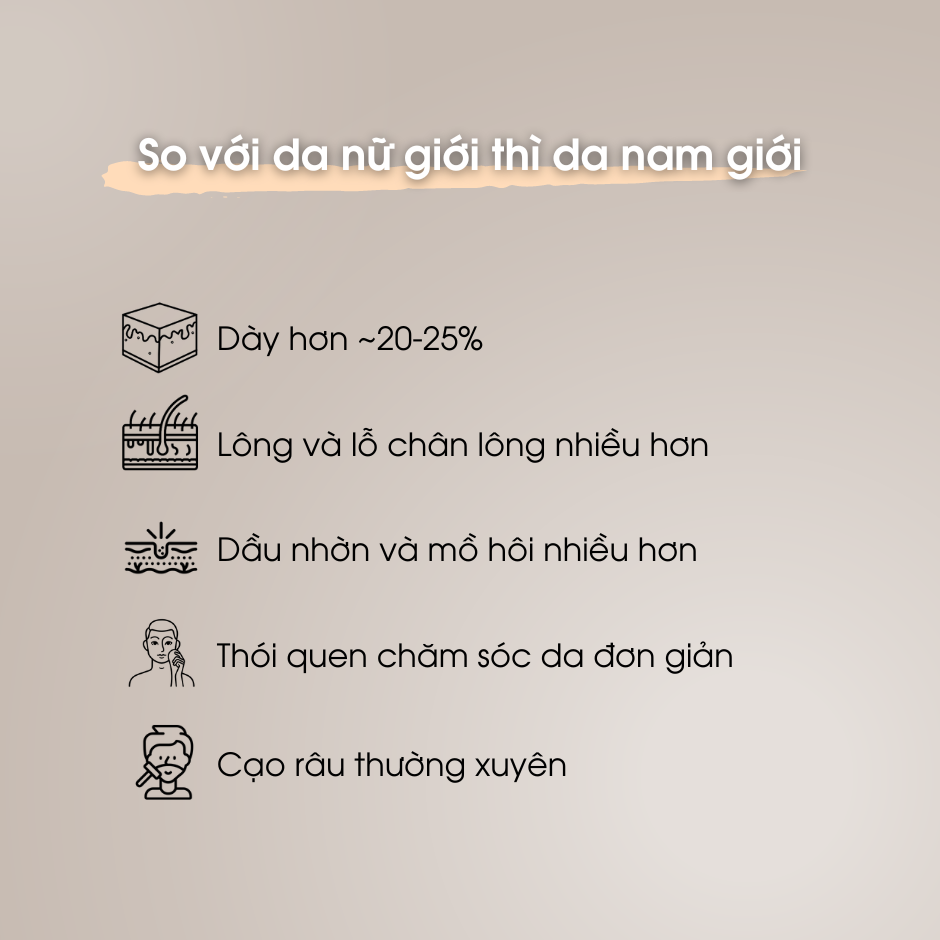 Nội tiết tố testosterone quyết định các đặc điểm nam tính của làn da nam giới và tạo cho nó một cấu trúc khác so với làn da phụ nữ. Nhìn chung, da nam giới trên cả mặt và cơ thể thường dày hơn, tiết nhiều dầu hơn và có tốc độ lão hoá khác biệt so với da nữ giới. Cùng với đó, việc cạo râu thường xuyên kiến da nam giới bị căng, kích ứng và nhạy cảm. Vì những điều này, nam giới khi được tiếp cận với các sản phẩm mỹ phẩm và chế độ chăm sóc da phù hợp sẽ giúp giữ cho làn da của phái mạnh ở trạng thái tự nhiên tốt nhất.